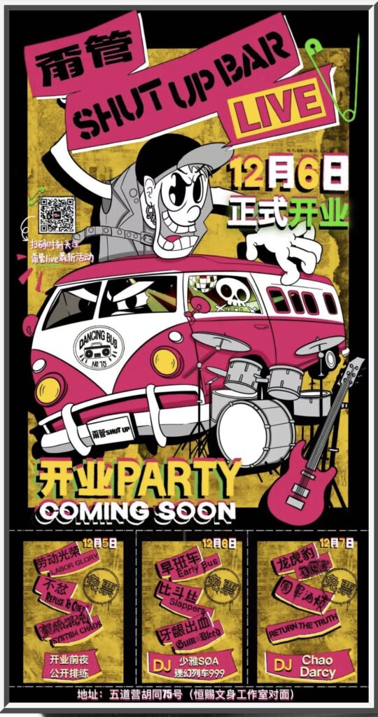 ま、そんなことでこの日もまたいろいろ北京の旧友と親交を深めていると、「明日、重要なイベントあるよ〜」という情報が耳に入る。聞けば、盲区の向かいにある昨日も行った甭管BARが近くに新しくパンクのライブハウスをオープンするという。このご時世にパンクの新しい場所ができるって、さすが北京。上海じゃありえない。で、そのオープニングのイベントだって。ひゃー、楽しそう。ただ、翌日の夜にはまた青島に戻る予定なので、ギリギリ行けない。悔しい〜